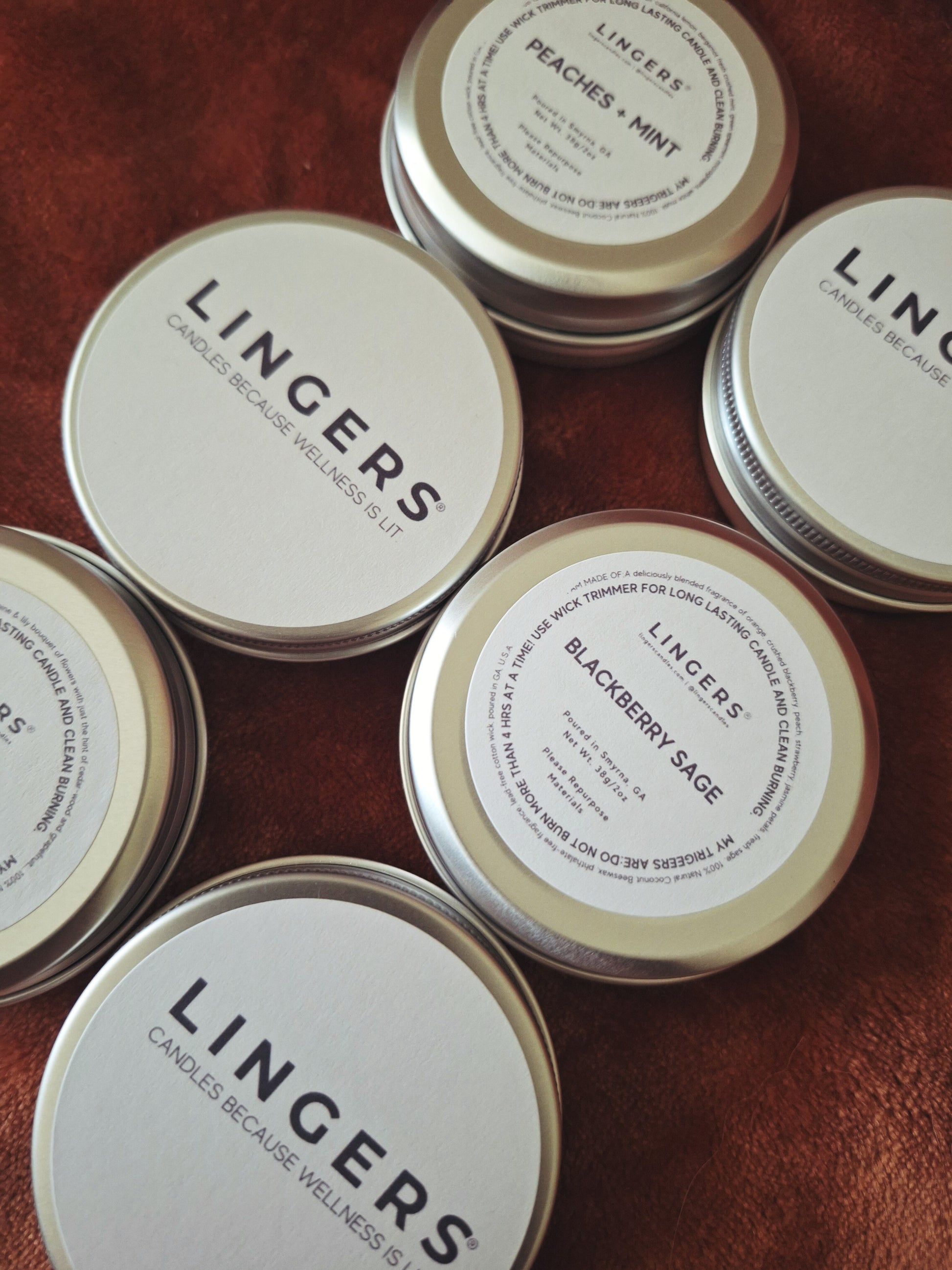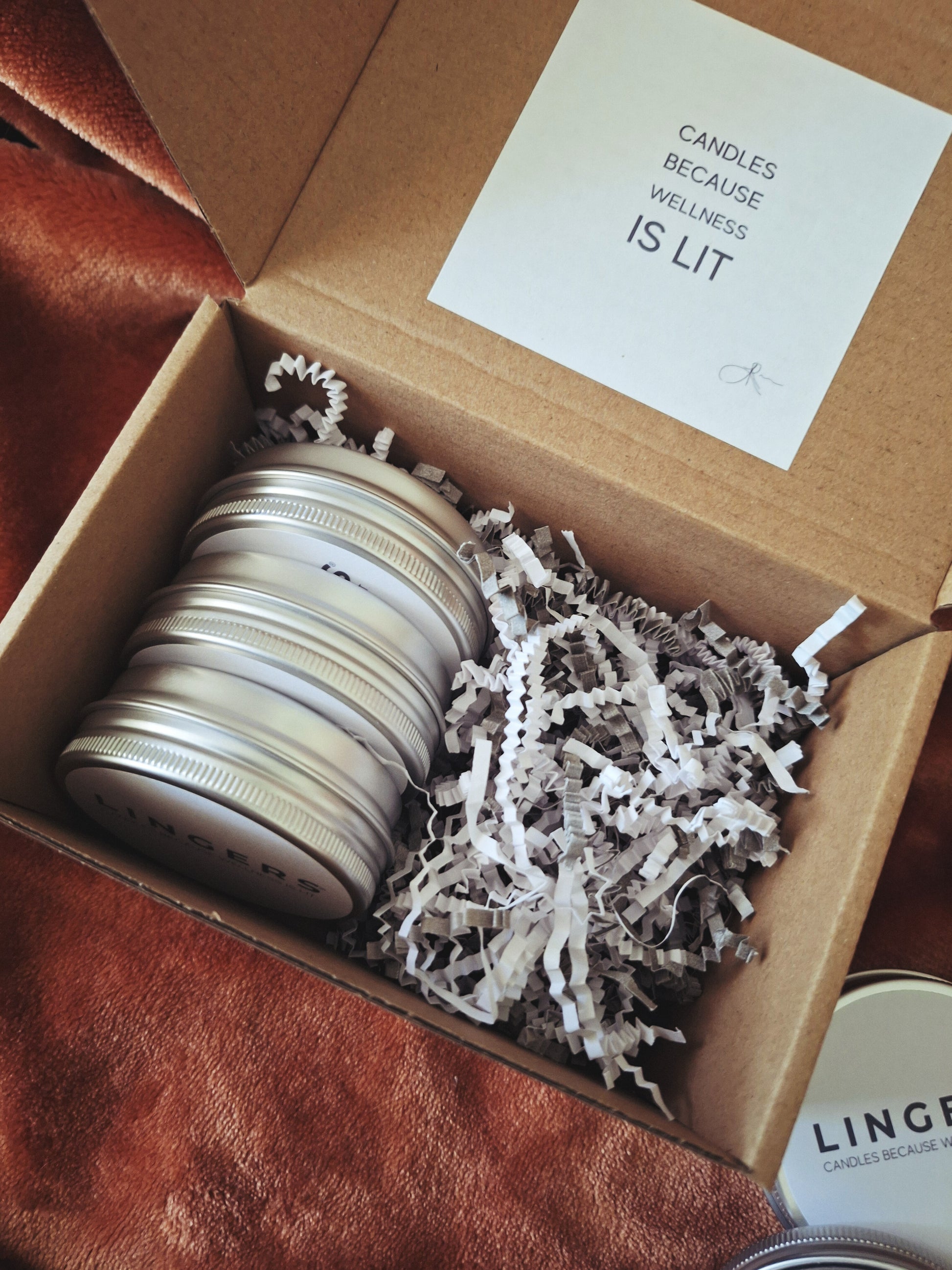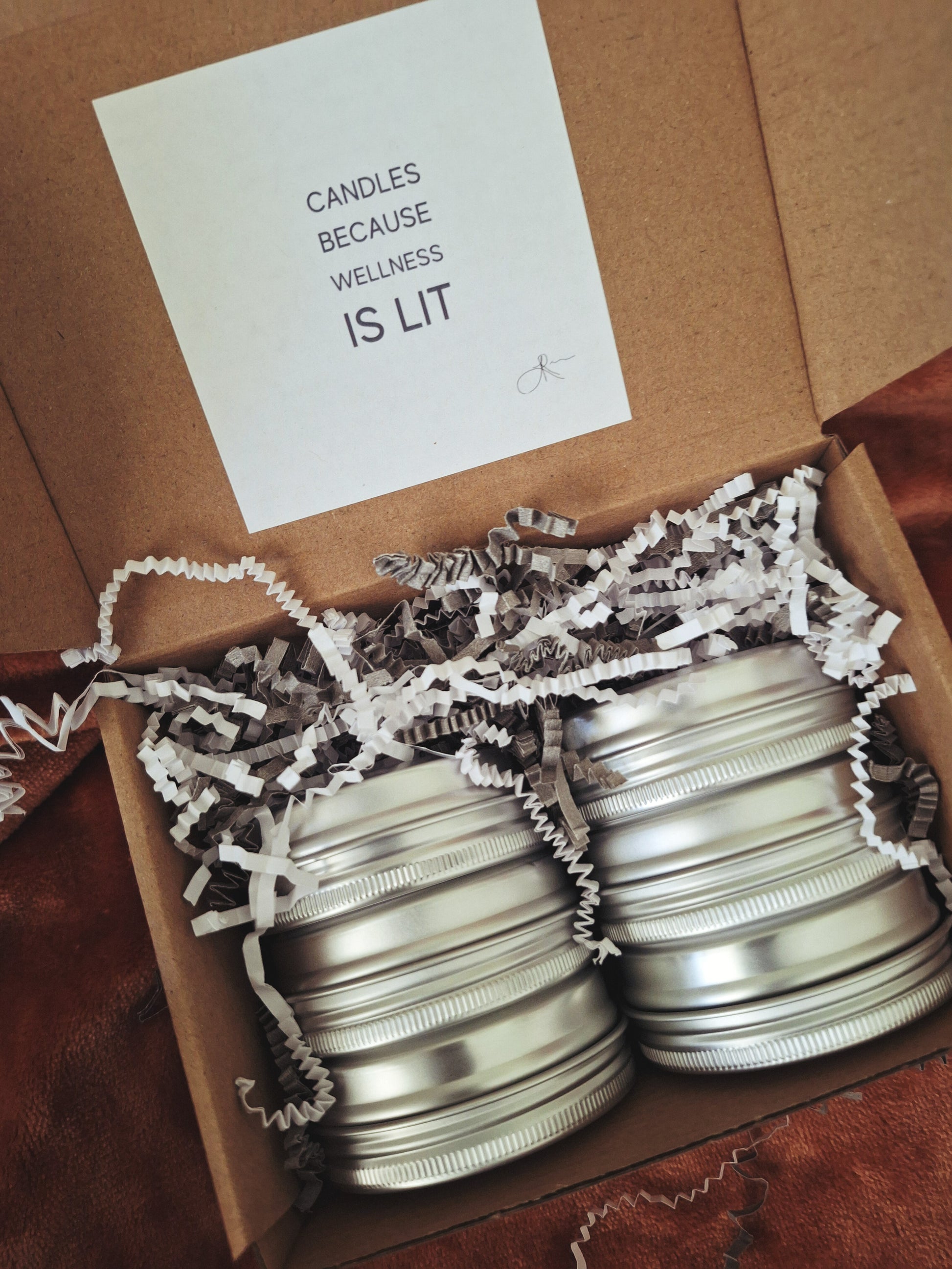 - Premium 2oz scented candle tins in your selected fragrances